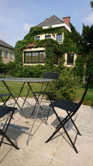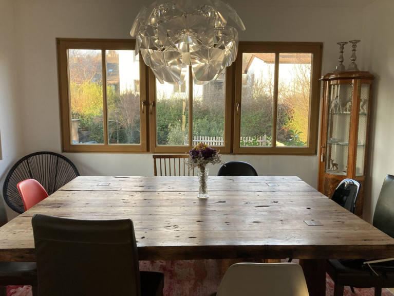 Im Erdgeschoß liegen ein Wohnzimmer, ein Esszimmer samt Kamin, eine Küche und ein WC. Vom Veranda-Zimmer haben Sie einen wunderbaren Blick auf den Garten und den Buchberg.