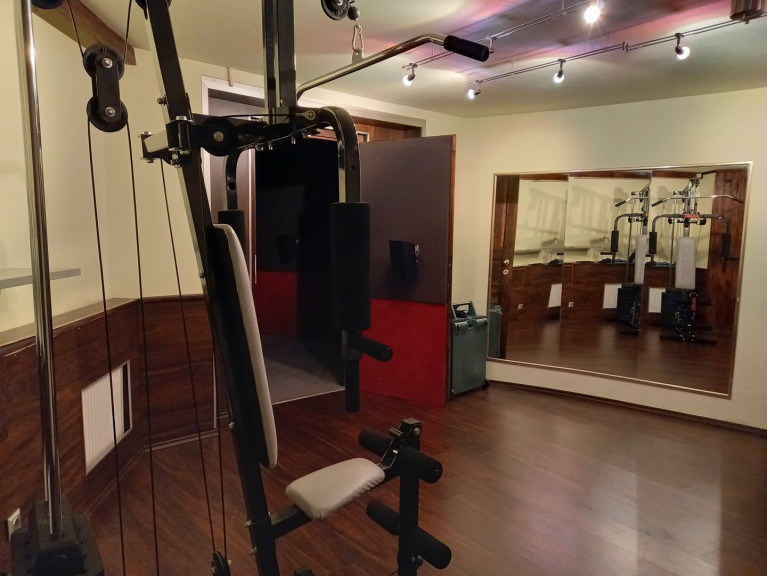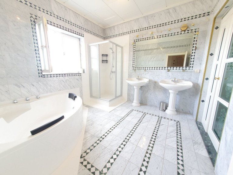 Fliesen, Parkett, Gas, Fußbodenheizung, Einbauküche, Badewanne, Dusche, Kabel/Satelliten-TV, Garage, Alarmanlage, Sauna