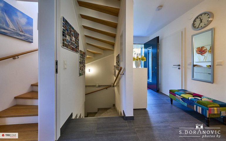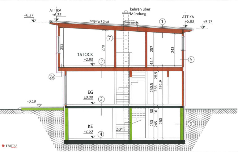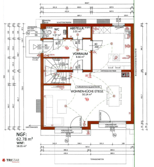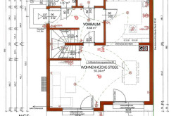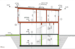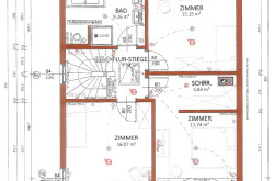 Das Haus hat ca. 186 m² Fläche (inkludiert ca. 57,62 m² Kellerbereich), wurde auf ca. 283 m² Grundfläche gebaut, und gliedert sich wie folgt: