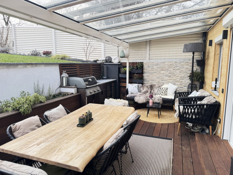 Die Einbauküche ist ein weiterer Höhepunkt dieser Immobilie. Sie bietet ausreichend Platz für kulinarische Abenteuer und ist der perfekte Ort, um mit Freunden und Familie zusammenzukommen. Der großzügige Wohnbereich öffnet sich zu ein, von dem Sie einen herrlichen Ausblick ins Grüne genießen können. Zusätzlich steht Ihnen eine Terrasse zur Verfügung, die zum Entspannen und Verweilen einlädt.