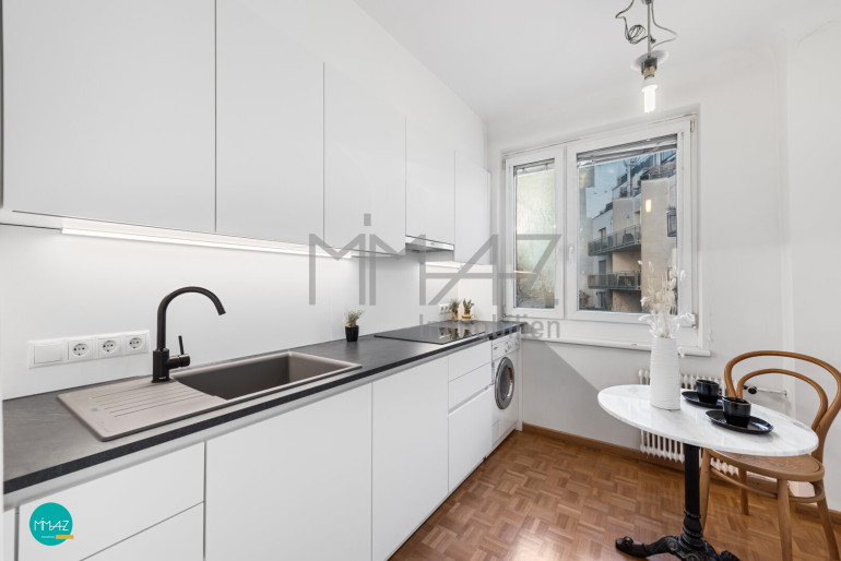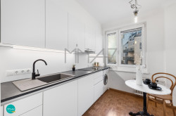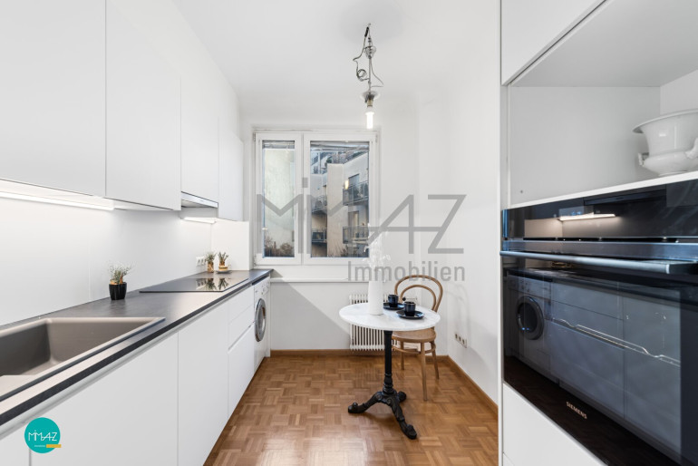 Ein besonderes Highlight stellt die erst vor wenigen Monaten neu eingebaute Küche dar, die sich in unbenütztem Zustand befindet. Sie ist hochwertig mit einem Induktionsherd, einem Geschirrspüler, einer großen Kühl-/Gefrierkombination, einem Backofen und sehr viel Stauraum ausgestattet. Der kleine Essbereich vor dem Fenster schafft zudem einen angenehmen Platz für den Start in den Tag.