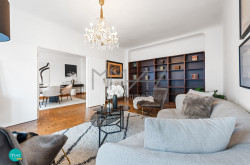 Gegenüber öffnen sich zwei weitere Zimmer, die durch eine klassische Flügeltüre miteinander verbunden sind. Werden beide Räume geöffnet, entsteht ein großzügiger Wohnsalon mit beeindruckender Raumwirkung und weitem Blick entlang der Franzensbrückenstraße bis zum Praterstern — ein Ort, der Großzügigkeit und urbanes Wiener Wohngefühl verbindet.