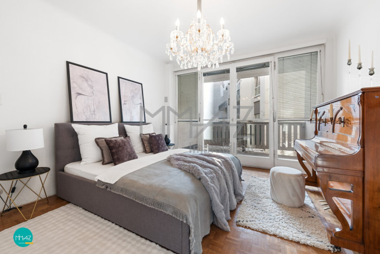 Das daneben liegende Kabinett sowie das große Master-Schlafzimmer mit Loggia sind westseitig in den ruhigen Innenhof ausgerichtet - ein geschützter Rückzugsort fernab des städtischen Trubels!