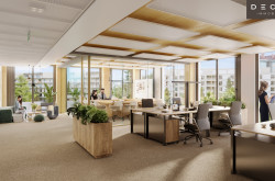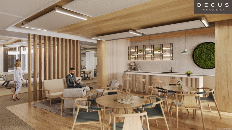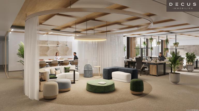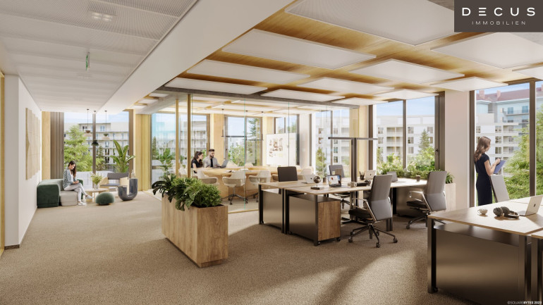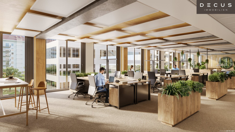 Hohe Decken, natürliche Holzoberflächen und eine flexible Raumeinteilung schaffen die besten Voraussetzungen für ein individuelles Bürokonzept. Moderne Heiz-/Kühlsegel-Technologie sorgt für größtmögliche thermische Behaglichkeit, Stehleuchten mit direktem bzw. indirektem Lichtanteil garantieren zu jeder Tageszeit die richtige Beleuchtung.