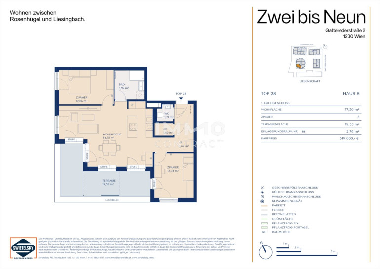 Die Lage des Projekts bietet das Beste aus beiden Welten: Die lebendige Stadt ist nur einen Katzensprung entfernt, während die umliegenden Grünflächen und der Liesingbach zum Durchatmen und Entspannen einladen. Zahlreiche Nahversorger wie Supermärkte, Drogerien und Apotheken befinden sich nur wenige Schritte entfernt, und auch ein Kindergarten liegt in unmittelbarer Nähe. Für kulinarische Genüsse sorgen namhafte Weingüter, Heurige und Gasthäuser während das Einkaufszentrum Riverside eine Vielzahl an Einkaufs- und Freizeitmöglichkeiten bietet. Sport- und Naturbegeisterte finden im Liesingbachgebiet und im neu geschaffenen Stadtpark Atzgersdorf ideale Orte für Spaziergänge, Laufrunden und Erholung. Selbst das beliebte Liesinger Bad ist mit dem Fahrrad in weniger als zehn Minuten erreichbar. Der nahegelegene Autobus bringt Sie in nur 13 Minuten nach Hietzing, und der Schnellbahn-Bahnhof Atzgersdorf ist lediglich eine kurze Spazierstrecke oder eine zweiminütige Busfahrt entfernt. Von dort aus erreichen Sie die zentralen Verkehrsknotenpunkte Wien Meidling und Wien Hauptbahnhof in nur sechs bzw. zwölf Minuten. Diese gute Anbindung macht das Projekt zur idealen Basis für ein urbanes Leben im Grünen – auch ohne eigenem Auto!Beschreibung der Immobilie