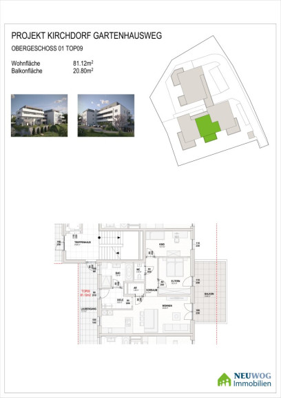 Die Immobilie befindet sich am Gartenhausweg in 4560 Kirchdorf an der Krems, einer Stadt in Oberösterreich. Sie liegt in einer ruhigen Gegend, in bester Zentrumslage in einer Sackgasse. Die 18 Wohneinheiten werden, im für die Fa. Neuwog üblichen, gehobenen Standard errichtet. NEUWOG steht für herzliche Betreuung und zufriedene Kunden!Beschreibung der Immobilie