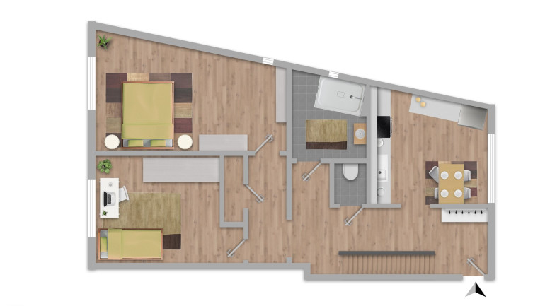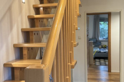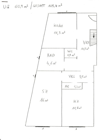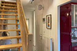 Im unteren Geschoss befinden sich Küche mit Essbereich, zwei Schlafzimmer, Badezimmer mit Wanne, separates WC, Abstellraum sowie zwei Vorräume.