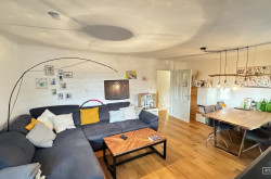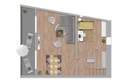 Das obere Geschoss bildet das Herzstück der Wohnung: Ein großzügiger Wohnbereich mit direktem Zugang zur südseitigen Terrasse öffnet den Raum ins Grüne und schafft ein besonderes Wohngefühl.