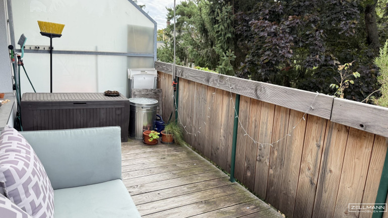 Die Terrasse wird in den warmen Monaten zum erweiterten Wohnraum. Absolute Ruhelage, südliche Ausrichtung und freier Blick ins Grüne bieten jene Lebensqualität, die in Wien zunehmend selten wird.