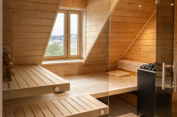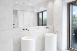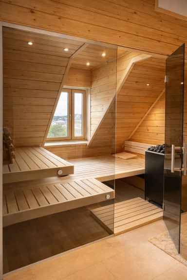 A mosaic rain shower with heated seating, steam bath preparation and an integrated Swiss stone pine sauna create a spa-quality environment within your own residence.