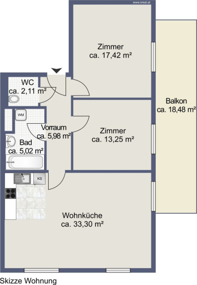 Sie suchen schon lange das perfekte Familiendomizil? Sie wollen im Grünen wohnen, aber verkehrstechnisch trotzdem gut angebunden sein? Dann ist dieses Objekt genau das Richtige für Sie. Es befindet sich im 1. Stock eines soeben 2021 erbauten Wohnhauses. Über den zentralen Vorraum sind alle Zimmer getrennt begehbar. Herzstück ist der 33 m² große Wohn-/Essbereich, bei dem Sie in Ihrer Gestaltung noch völlig frei sind. Der Raum ist besonders hell, da er nicht nur über einen direkten Ausgang auf den südostseitigen Balkon hat, sondern überdies noch über große französische Fenster verfügt. Auch die beiden geräumigen Schlafzimmer haben direkten Zugang zu dem Balkon. Bad und WC sind getrennt. Im Haus selbst befindet sich ein Kleinkindspielplatz, ein Jugendraum und selbstverständlich auch ein Fahrradkeller. Der Wohnung selbst ist außerdem ein eigenes Kellerabteil zugeordnet. Ein Garagenplatz ist um EUR 100.- anzumieten.