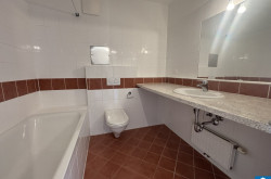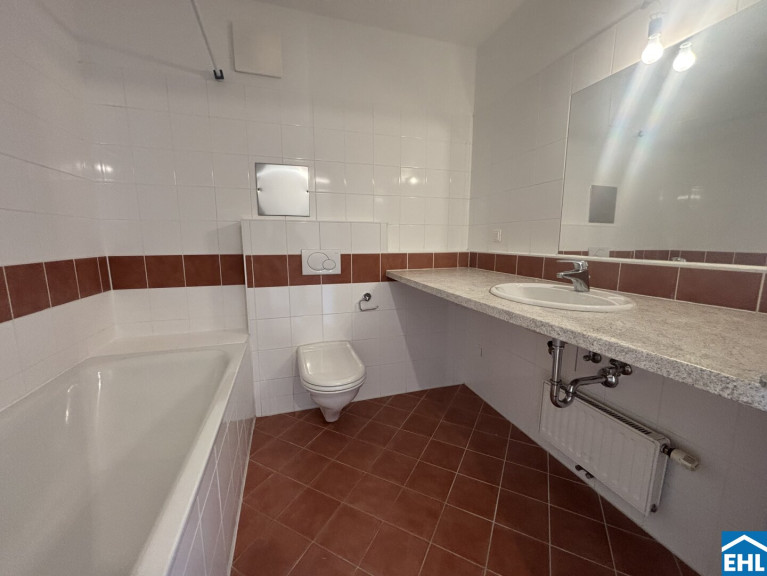 - Badezimmer mit Badewanne, WC und Waschmaschinenanschluss