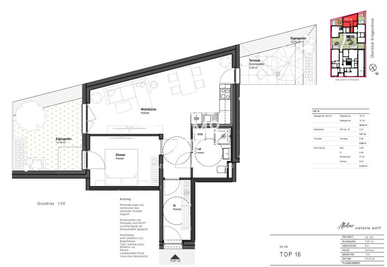 Zum Verkauf gelangen 16 topmoderne, schlüsselfertige Wohnungen mit Außenflächen (Garten, Balkon, Terrassen) sowie 1 Gechäftslokal und 9 Tiefgaragen-Stellplätze.