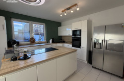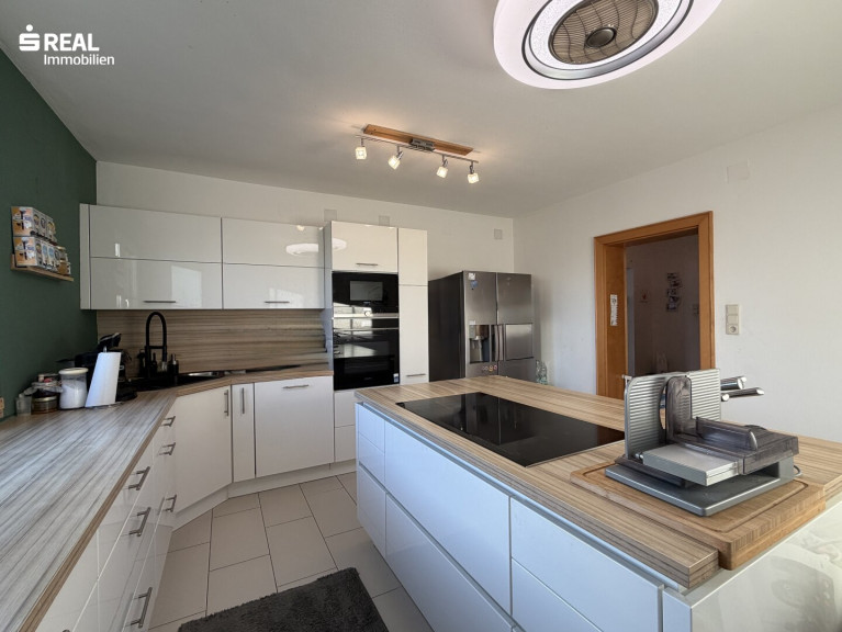 - helle, moderne Küche mit Kochinsel, viel Arbeitsfläche und angenehmen Raumgefühl; bei Bedarf durch eine Tür vom Wohnbereich trennbar