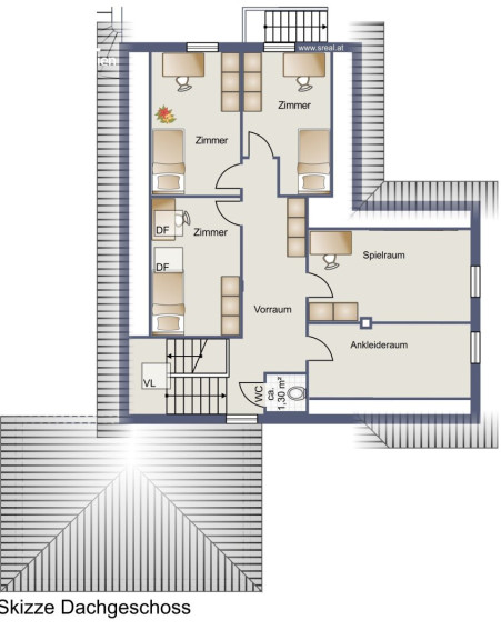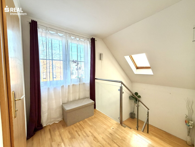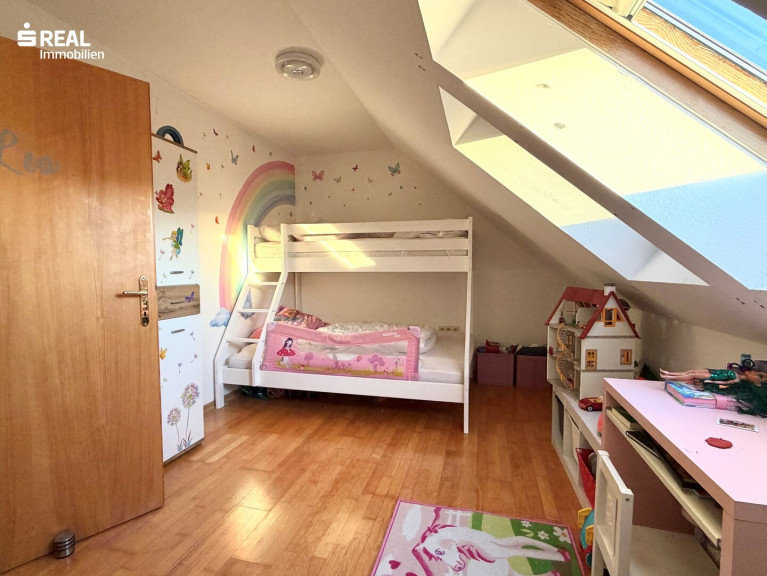 - zwei spiegelverkehrt angeordnete Räume mit Dachschräge, die derzeit als Ankleideraum & Spielzimmer genutzt werden – auch als Büro, Gäste- oder Hobbyraum geeignet