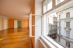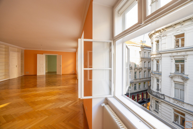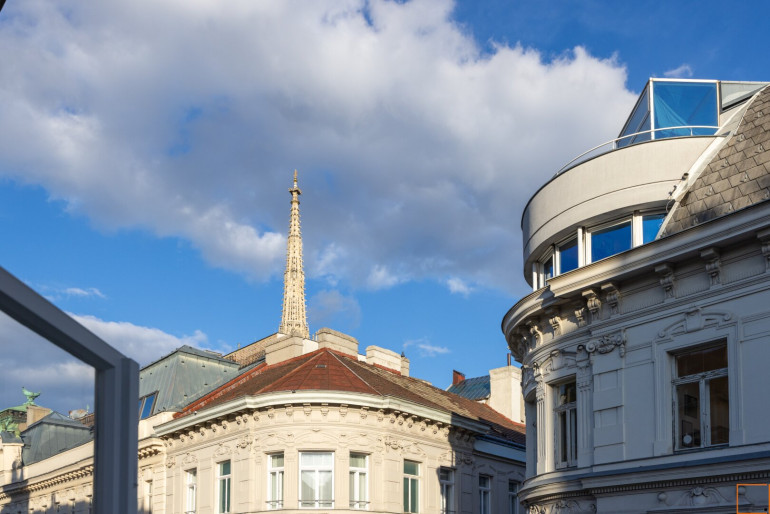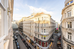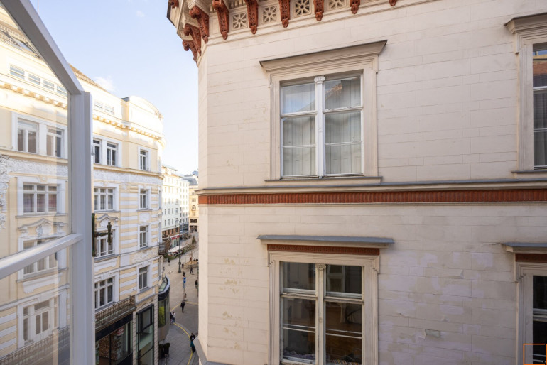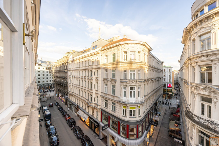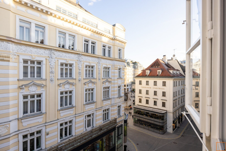 Besonders beeindruckend ist der prachtvolle Wohnsalon mit 5 großen Fenstern in südostseitiger Ausrichtung. Die großen Fenster weisen in Richtung Seilergasse, Neuer Markt, Kärntner Durchgang bzw. Kärntner Straße und in die Göttweigergasse. Die drei restlichen Räume haben Blickachsen zum Kärntner Durchgang/zur Kärntner Straße bzw. in die Göttweigergasse. Sogar die Spitze des Wiener Stephansdoms ist von hier aus zu sehen.