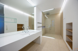 - Bad 2 mit großer Walk-In-Dusche, Doppelwaschbecken, Fußbodenheizung und Fenster in Richtung Pawlatsche