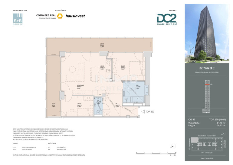 Der DC2 Tower liegt in der Donau-City, Wiens internationalstem Business- und Wohnstandort. • U1-Station „Kaisermühlen/VIC“ in unmittelbarer Nähe: 8 Minuten zum Stephansplatz • Direkte Anbindung an Hauptverkehrsachsen und Autobahnen • Flughafen Wien in 20 Minuten erreichbar • Die Umgebung bietet Restaurants, Freizeitmöglichkeiten, den Donaupark, das Kaiserwasser sowie Hotels und kulturelle Einrichtungen – ideal für internationale Geschäftspartner. Die Lage des DC2 Towers in der Wiener Donau-City bietet eine in Wien einzigartige Kombination aus urbanem Business-Umfeld und großflächigen Erholungsräumen. Kaum ein anderer Standort verbindet internationale Infrastruktur so direkt mit Natur, Sport und Freizeit. In wenigen Gehminuten erreicht man das Kaiserwasser sowie die Alte Donau, zwei der beliebtesten Freizeit- und Badegebiete Wiens.Beschreibung der Immobilie