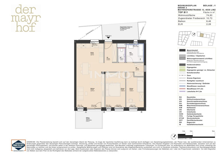Das Projekt G r ü n G e b o r g e n befindet sich am ruhigen Rand des Linzer Stadtteils Neue Heimat, eingebettet in eine angenehme Wohngegend. In einer Sackgasse ohne Durchzugsverkehr gelegen, bietet die Adresse ein hohes Maß an Privatsphäre und Lebensqualität. Direkt angrenzend erstreckt sich eine Einfamilienhaussiedlung, in unmittelbarer Nachbarschaft befinden sich gepflegte Schrebergärten – ein Bild von Ruhe und naturnahem Wohnen. Im näheren Umfeld sorgen einige Gewerbebetriebe sowie der Maximarkt als Nahversorger für kurze Wege im Alltag. Ein besonderes Highlight ist die Nähe zur Traunau, einem geschützten Naturparadies, das nur wenige Minuten entfernt liegt. Die weitläufige, naturbelassene Aulandschaft lädt zu Spaziergängen, Joggingrunden oder Radtouren ein – über schmale, reizvolle Pfade mitten durch die grüne Oase. Auch in puncto Mobilität ist das Projekt G r ü n G e b o r g e n gut angebunden: Die Bushaltestelle Baintwiese befindet sich direkt beim Wohnprojekt und bietet Anschluss an den Stadtverkehr sowie Schnellbuslinien. Wer lieber mit dem Zug unterwegs ist, erreicht den Bahnhof Linz-Wegscheid in rund 15 Gehminuten.Beschreibung der Immobilie
