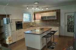 - Moderne Küche (Marke Breitschopf, Maßanfertigung vom Tischler) mit Naturstein-Arbeitsplatten, Kochinsel (90 cm Induktionsfeld), hochwertigen Einbaugeräten und Essbereich