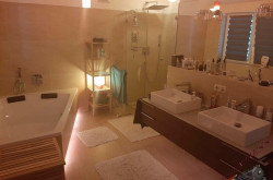 - Modernes Badezimmer mit freistehender Badewanne, bodengleicher Regendusche, Doppelwaschbecken
