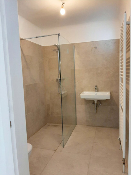Bad mit Dusche, Waschbecken, WC, großer Handtuchheizkörper, Fenster + Lüftung