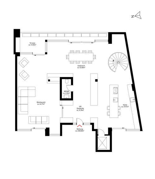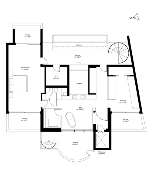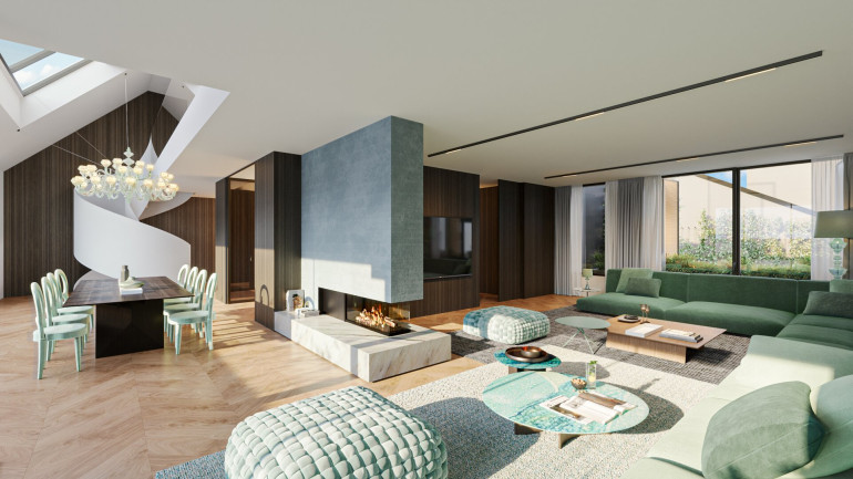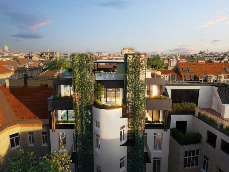 Besonderes Augenmerk wurde auf die Außenflächen gelegt: Zwei begrünte Dachgärten mit Baumbepflanzung im Hof, mehrere über die Etagen verteilte Terrassen sowie eine spektakuläre Dachterrasse über der Masterebene mit beeindruckendem 360°-Panoramablick über Wien schaffen außergewöhnliche Freiräume. Die Dachterrasse ist unter anderem mit Whirlpool, Pergola und Outdoor-Küche ausgestattet und bietet höchsten Wohnkomfort unter freiem Himmel.