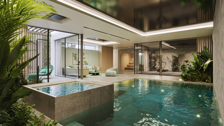 Auf der ersten Hof-Etage entsteht ein exklusiver Wellnessbereich, der in Art und Dimension selbst höchsten Hotelstandards entspricht: Ein bodenbündiges Hallenschwimmbad, Whirlpool, Sauna, Dampfbad sowie ein verglaster Fitnessbereich bieten ein privates Spa-Erlebnis der Extraklasse.