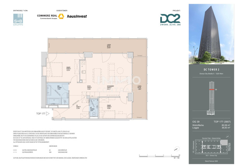 Der DC2 Tower liegt in der Donau-City, Wiens internationalstem Business- und Wohnstandort. • U1-Station „Kaisermühlen/VIC“ in unmittelbarer Nähe: 8 Minuten zum Stephansplatz • Direkte Anbindung an Hauptverkehrsachsen und Autobahnen • Flughafen Wien in 20 Minuten erreichbar • Die Umgebung bietet Restaurants, Freizeitmöglichkeiten, den Donaupark, das Kaiserwasser sowie Hotels und kulturelle Einrichtungen – ideal für internationale Geschäftspartner. Die Lage des DC2 Towers in der Wiener Donau-City bietet eine in Wien einzigartige Kombination aus urbanem Business-Umfeld und großflächigen Erholungsräumen. Kaum ein anderer Standort verbindet internationale Infrastruktur so direkt mit Natur, Sport und Freizeit. In wenigen Gehminuten erreicht man das Kaiserwasser sowie die Alte Donau, zwei der beliebtesten Freizeit- und Badegebiete Wiens.Beschreibung der Immobilie