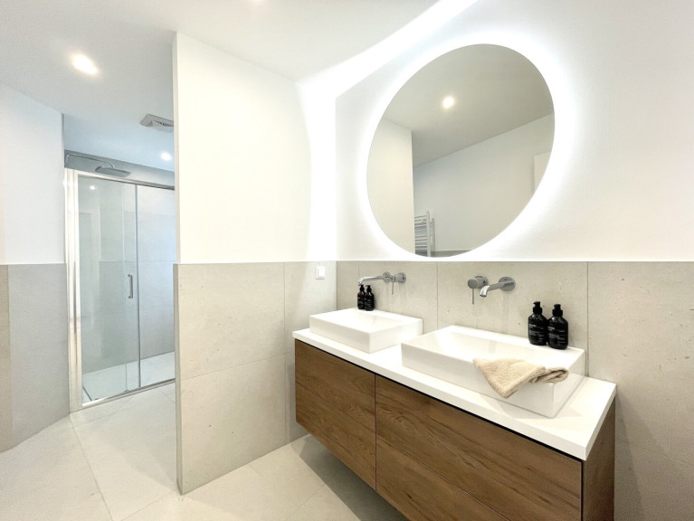 Die durchdachte Raumaufteilung umfasst zwei elegante Bäder und zwei separate WCs, die Komfort und Privatsphäre bieten. Hochwertige Materialien wie Fliesen und Parkett sorgen für ein stilvolles Wohnambiente, während die Etagenheizung und die Klimaanlage für ein angenehmes Raumklima zu jeder Jahreszeit sorgen.