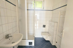 Badezimmer mit Dusche, Handwaschbecken, Handtuchheizung, Waschmaschinenanschluss und WC