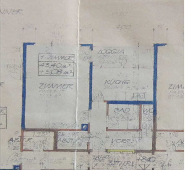 Sie ist 43,40 m² groß, zuzüglich der Loggia von 5,08 m². sowie Kellerabteil.