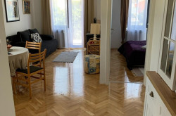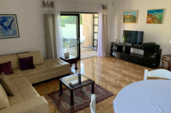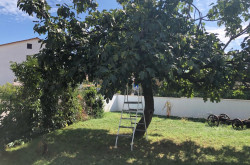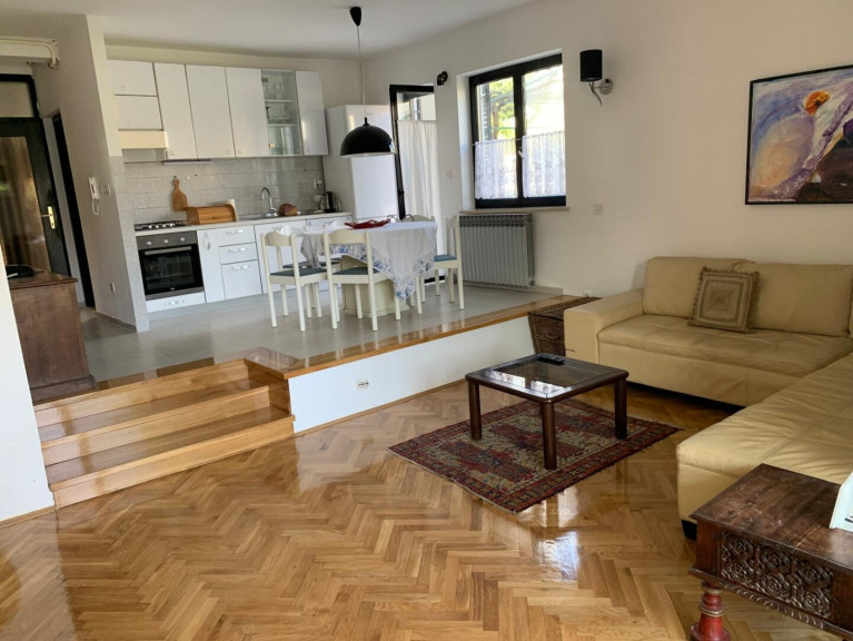 Das Apartment im Erdgeschoss besteht aus einem Schlafzimmer, Badezimmer, Küche mit Essbereich sowie einem hellen Wohnzimmer mit direktem Zugang zum großen Garten. Dieser bietet viel Platz zum Entspannen, für gesellige Abende oder zur individuellen Gestaltung — sogar der Bau eines Pools ist problemlos möglich.