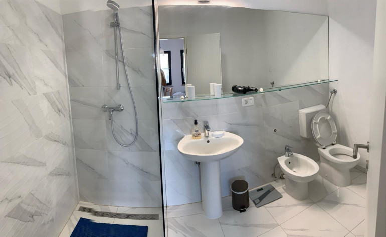 Über eine Innentreppe gelangen Sie in das erste Obergeschoss. Hier befindet sich ein großzügiges Apartment mit zwei Schlafzimmern, Badezimmer, Küche, Esszimmer und lichtdurchflutetem Wohnzimmer mit Zugang zu einer großen Terrasse — ideal, um das mediterrane Klima ganzjährig zu genießen.