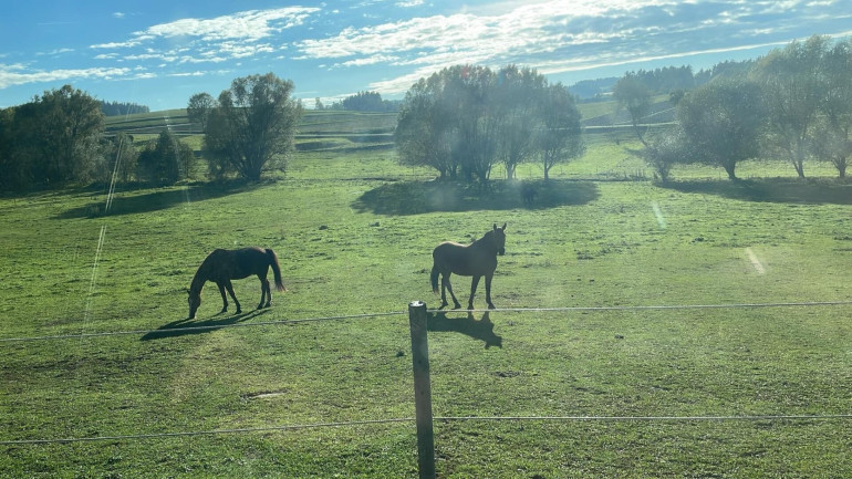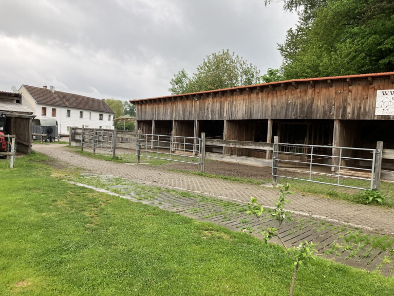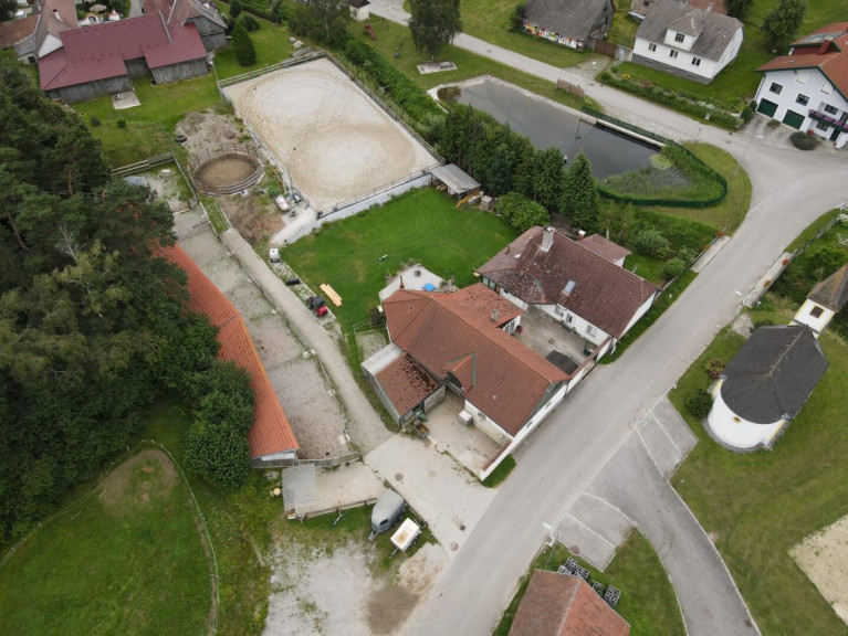 Ein gemütliches, geschmackvoll eingerichtetes Wohnhaus, etwa 170 qm Wohnfläche auf ca. 90 qm Grundfläche plus Reiterstüberl grenzt an einen Garten von ca. 800 qm und an Reitplatz 20 x 40 (Halle möglich) und Stallgebäude (bei Offenstall-Haltung ca.30 Pferde, bei Fixboxen 21). Insgesamt 4.000 qm Eigengrund; Bauland Agrar. Ca. 6.000 qm Koppel zugepachtet(unbefristet, 600,-/Jahr)