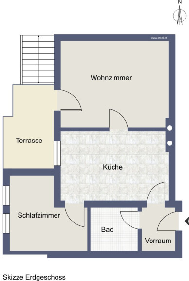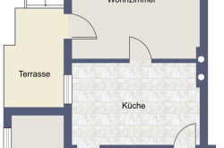 Die Wohnung setzt sich zusammen aus einem Wohnzimmer mit Zugang zur westseitigen Terrasse, einem Schlafzimmer, einer Küche mit Essecke als Verbindung zwischen dem Wohn- und dem Schlafzimmer, einem innenliegenden Bad mit Dusche & Waschmaschinenanschluss und einem Vorraum mit Garderobe.