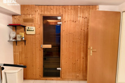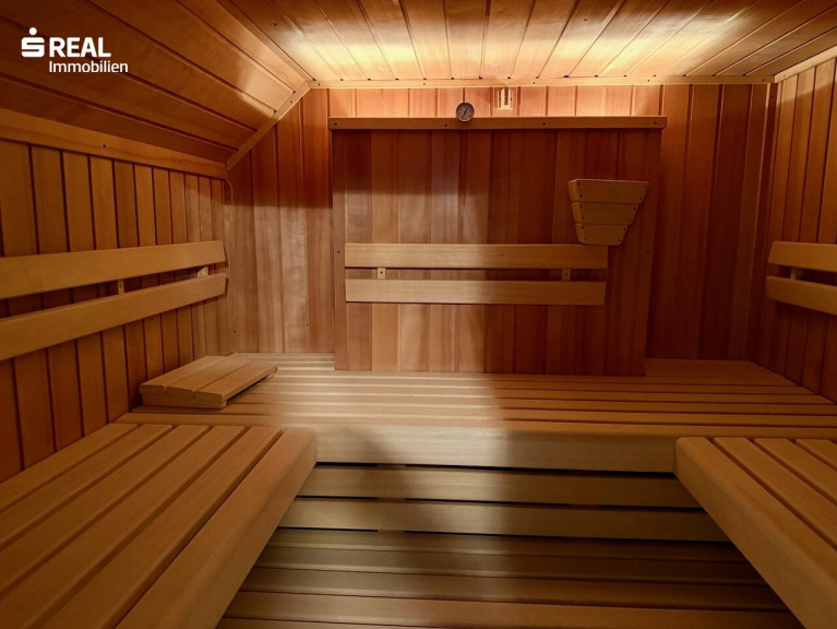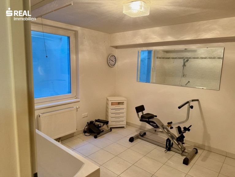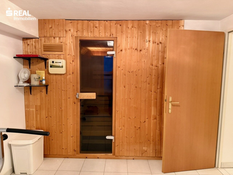 Das Kellergeschoß hat einen Wellnessbereich mit einer Sauna, Badewanne und Dusche im Badezimmer sowie zusätzlich großzügige Lagerräume auf.