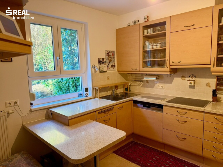 Fliesen, Laminatboden, Gas, Etagenheizung, Einbauküche, Südbalkon, Bad mit Fenster, Badewanne, Dusche, Garage, Sauna