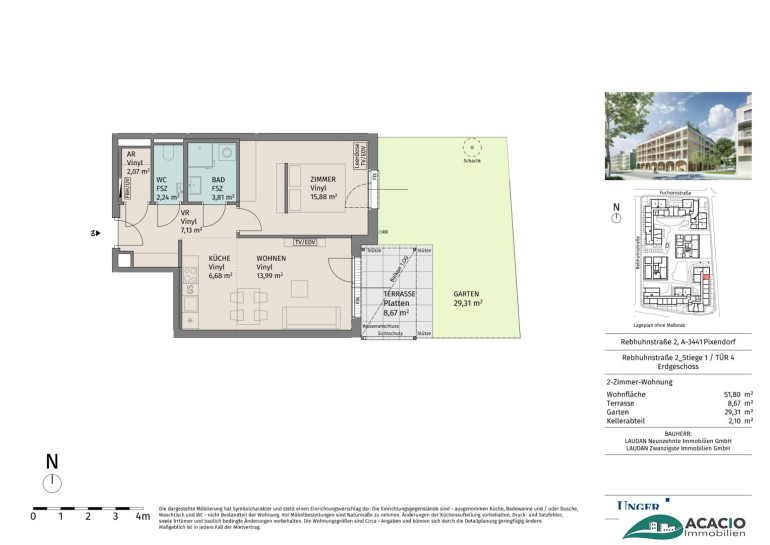 Die neu errichtete, moderne Wohnhausanlage liegt in Pixendorf, einer Ortschaft der Marktgemeinde Michelhausen, in einer der aufstrebensten Regionen Niederösterreichs. Michelhausen selbst verfügt über eine gute Infrastruktur wie Volksschule, Kindergärten, Postpartner, Ärzte (Primärversorgungszentrum Tullnerfeld), Lebensmittelmarkt, Bank, Gastronomie uvm. Die lebenswerte Bezirksstadt Tulln bietet ein Komplettangebot an Bildungs-, Einkaufs- und Freizeiteinrichtungen sowie medizinischer Betreuung und ist ca. 15 Autominuten entfernt. St. Pölten und Krems erreichen Sie in rund 30 Fahrminuten, Wien in ca. 40 Minuten. Zwischen Wienerwald und Donauauen gelegen bietet das Tullnerfeld einen Mehrwert an Lebensqualität. Ein wichtiger Impuls für die regionale Entwicklung des Tullnerfeldes entstand durch die Eröffnung des Bahnhofs Tullnerfeld, welcher weniger als 5 Autominuten von der Wohnhausanlage entfernt ist. Er bietet eine ausgezeichnete öffentliche Anbindung nach Wien oder Sankt Pölten.und sogar direkt zum Flughafen Wien-Schwechat: Wien Hütteldorf – 11 Minuten Sankt Pölten - 14 Minuten Wien Westbahnhof - 22 Minuten Wiener Hauptbahnhof - 22 Minuten Flughafen Wien - 45 MinutenBeschreibung der Immobilie