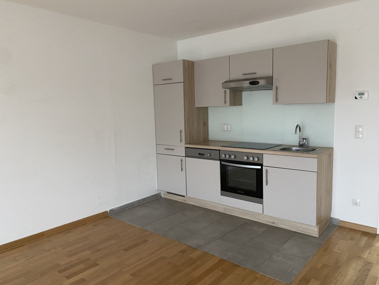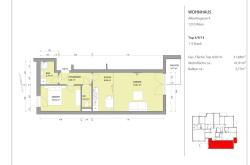 Die Wohnung gliedert sich in eine Küche, die vom Wohnzimmer räumlich abgetrennt ist, ein Vorzimmer, einen Schlafraum und ein Bad mit Dusche und getrenntem WC. Die Wohnung verfügt über ein Kellerabteil. Alle Räume sind vom Vorzimmer zentral begehbar. Im Badezimmer ist ein Waschmaschinenanschluss vorhanden.