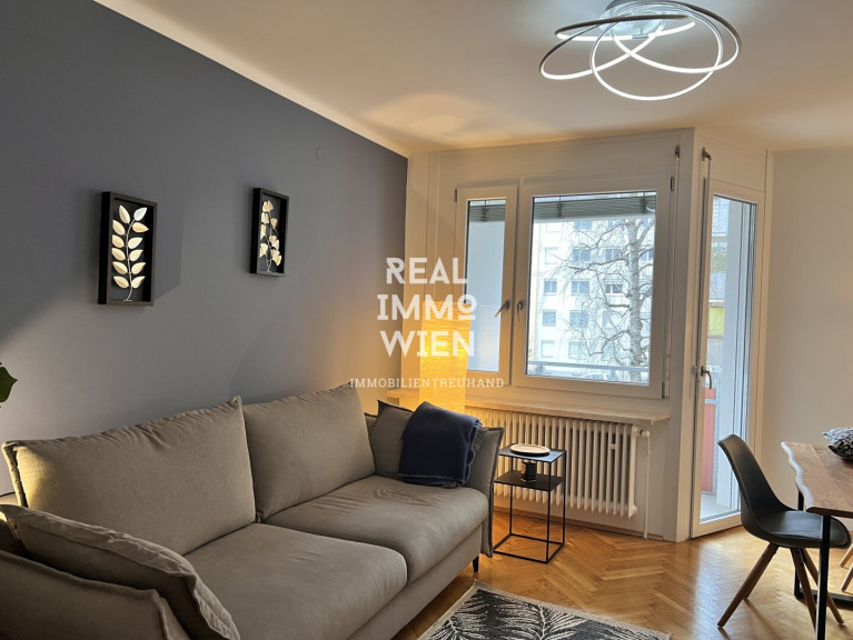 Die stilvolle Wohnung ist aufgeteilt in Vorraum, Wohnzimmer, Küche, Badezimmer mit separatem WC, 2 Schlafzimmer und Balkon.
