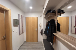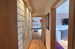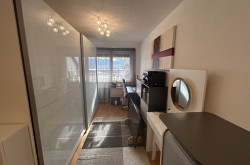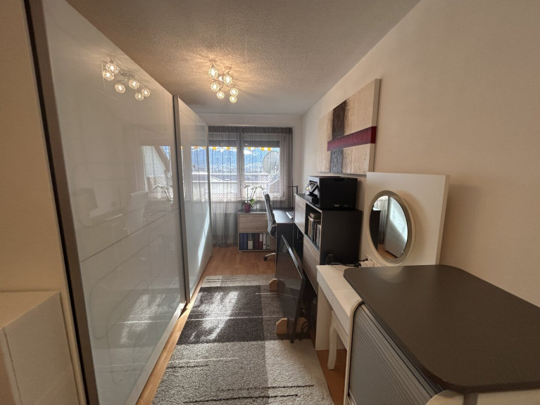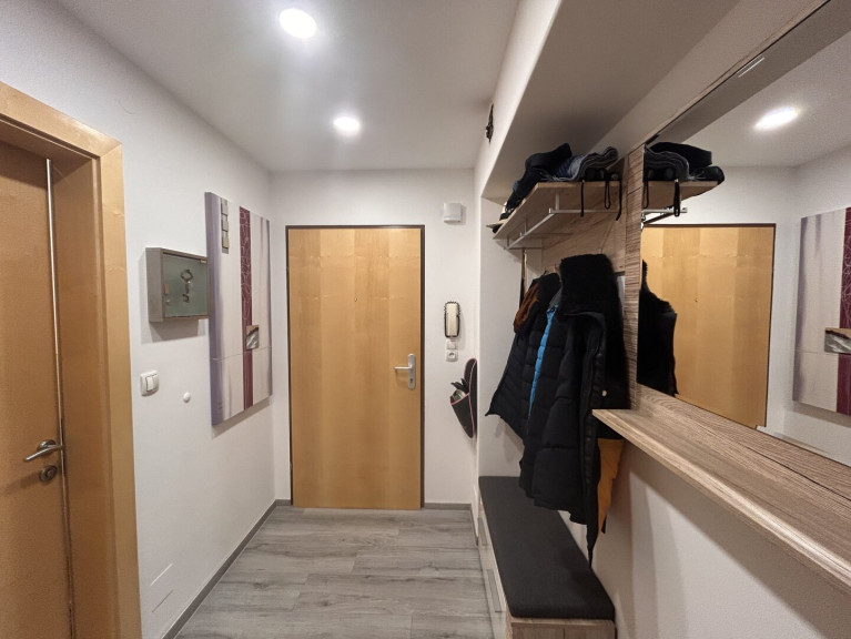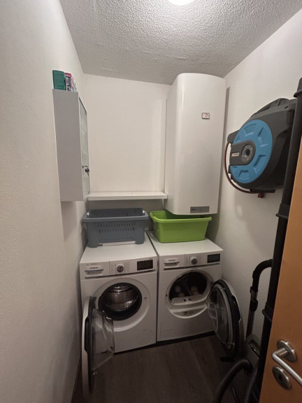 Auch funktional überzeugt die Wohnung: Zwei Einbauschränke bieten praktischen Stauraum, ein Abstellraum mit Waschmaschinenanschluss erleichtert den Alltag, und das Kellerabteil befindet sich bequem auf derselben Ebene wie die Wohnung. Besonders praktisch sind die zwei möglichen Zugänge – entweder über das Erdgeschoss oder über den oberen Eingang im fünften Stock.
