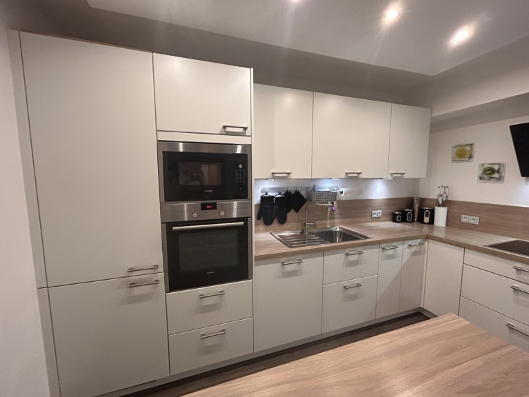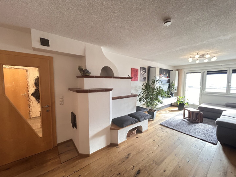 Der zentrale Wohn- und Essbereich bildet das Herzstück der Wohnung. Hier treffen Fußbodenheizung, ein klassischer Kachelofen und großzügige Fensterflächen aufeinander und sorgen ganzjährig für Behaglichkeit – im Winter ebenso wie an sonnigen Tagen. Die Küche ist funktional und zeitlos gestaltet: Eine weiße Einbauküche mit Siemens-Einbaugeräten, klaren Linien und ausreichend Arbeitsfläche, ideal für den Alltag ebenso wie für gesellige Abende. Der Kachelofen fügt sich harmonisch ein und verleiht dem Raum eine besondere Wohnqualität.