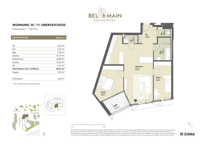 Gesamtmiete (inkl. BK, Heiz- und Warmwasserkosten, Kühlung, Lift und Steuern): € 2.380,71