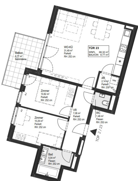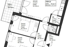 Parkett, Fliesen, Fußbodenheizung, Einbauküche, Westbalkon, Badewanne