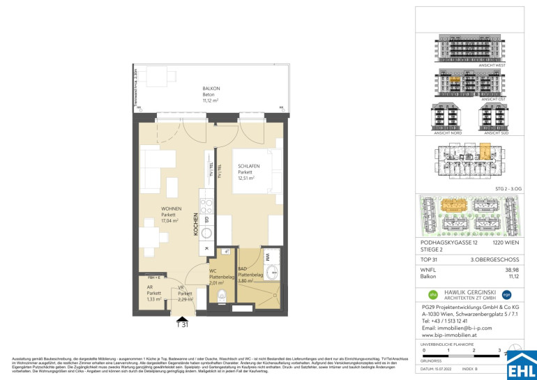 Parkett, Fliesen, Fußbodenheizung, Einbauküche, Wohnküche / offene Küche, Personenaufzug, Ostbalkon, Dusche, Tiefgarage