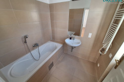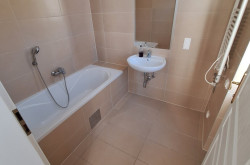 - Modernes Wannenbad mit Waschmaschinenanschluss und mit Fenster vom Zimmer aus zu begehen