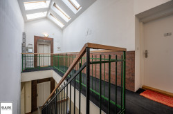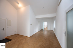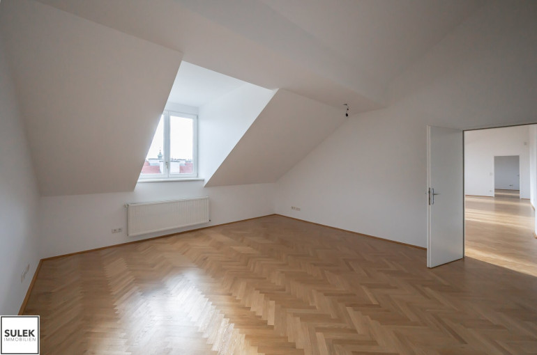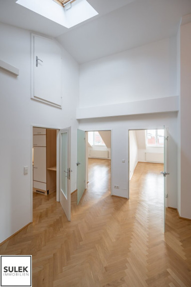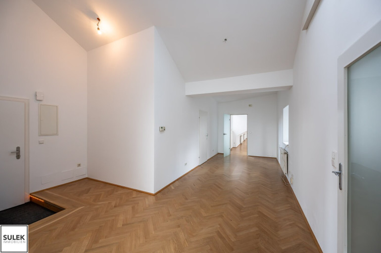 Das Büro versprüht eine exklusive Arbeitsatmosphäre. Edles Fischgrätparkett zieht sich durch die Räume, während zahlreiche, große Dachflächenfenster für maximales Tageslicht sorgen. Die Büroeinheit wurde kürzlich frisch weiß ausgemalt.