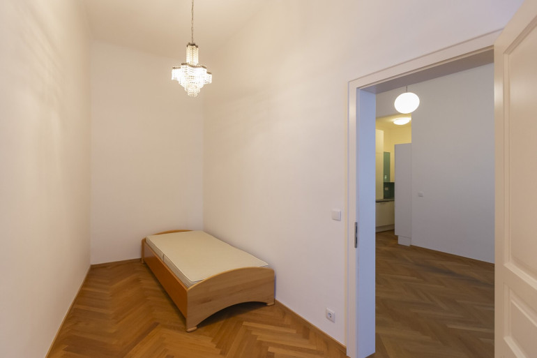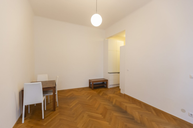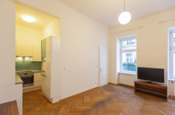 Wohnzimmer mit angrenzender (abgetrennter) Einbauküche, Schlafzimmer, Vorzimmer,