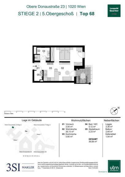 Diese moderne Wohnung befindet sich im 5. Obergeschoß. Die Einheit verfügt über eine Wohnnutzfläche von insgesamt 39,08 m² und bietet zusätzlich eine ca. 3,38 m² große Loggia und einen 2,49 m² großen Balkon.